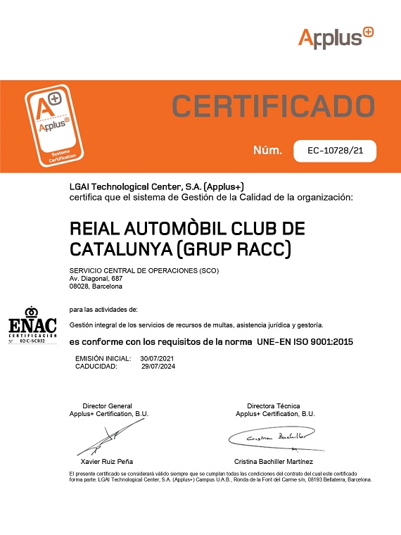 Certificado que reconoce la implantación de un sistema de gestión de calidad en los servicios de recursos de multas, asistencia jurídica y gestoría.