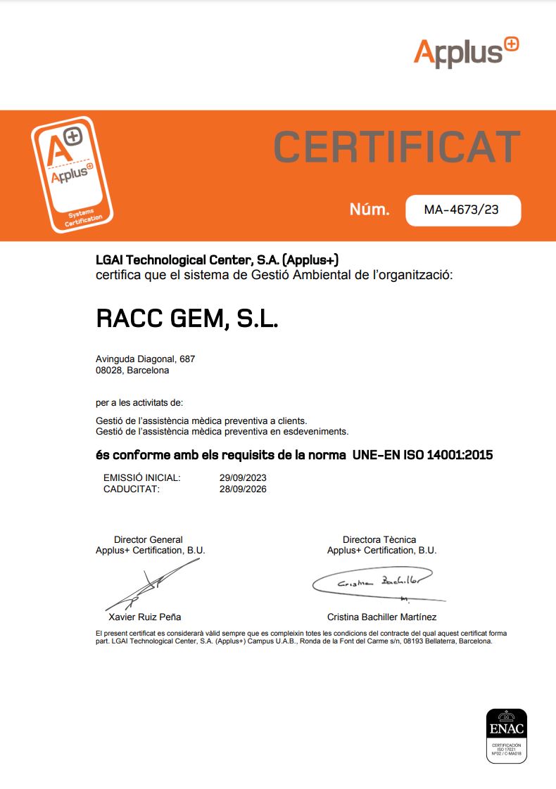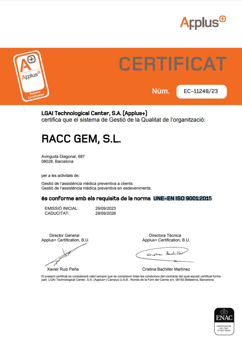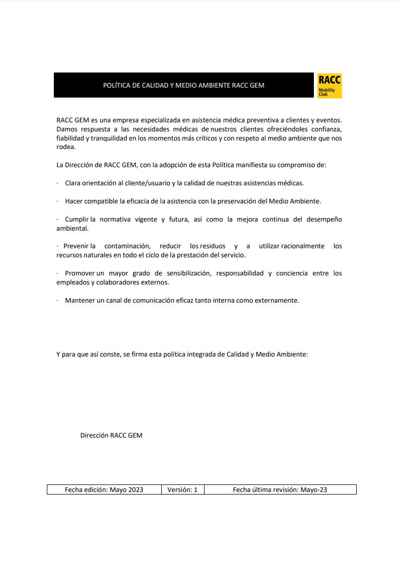 La política de calidad y medio ambiente de RACC GEM establece los ejes generales que deben regir la gestión de calidad de la asistencia médica preventiva a clientes y eventos, mediante los principios de control y mejora de los procesos operativos.