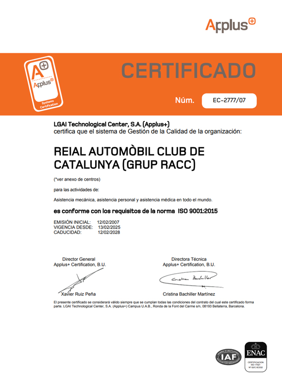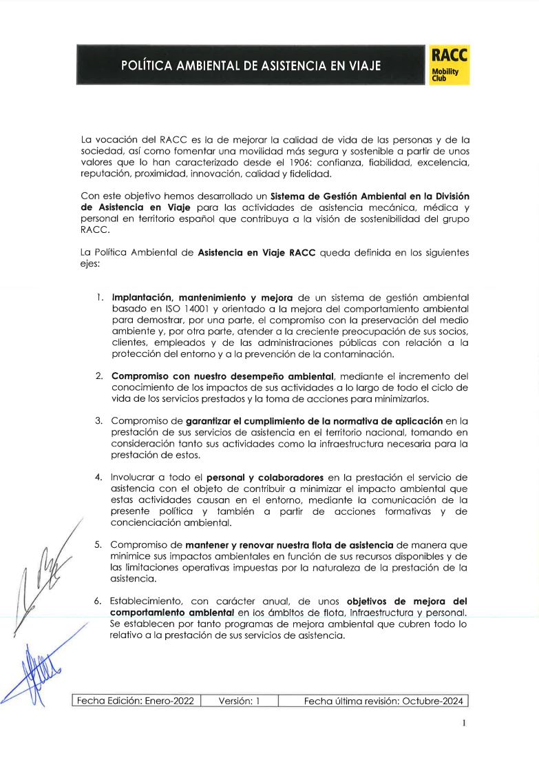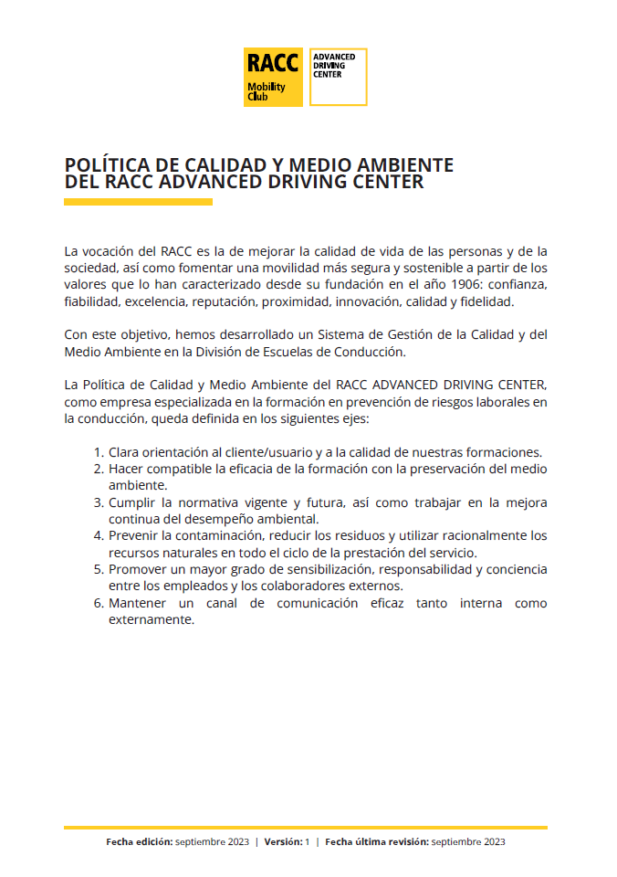 Política que establece los ejes generales que deben regir la gestión de calidad de la Asistencia en Viaje del RACC, mediante los principios de control y mejora de los procesos operativos.