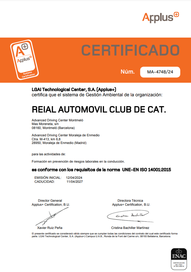 Certificado de la FIA que reconoce el plan medioambiental implantado por el RACC en la organización del RallyRACC – Catalunya Costa Daurada usando motos eléctricas, coches de bajas emisiones y sistemas de reciclaje de residuos.